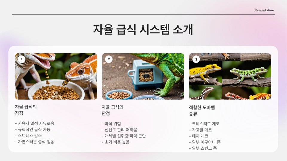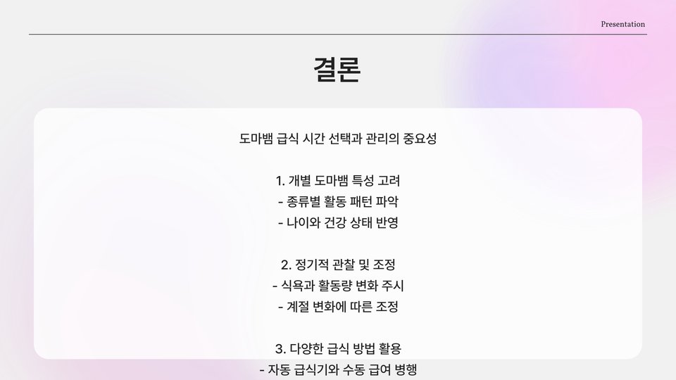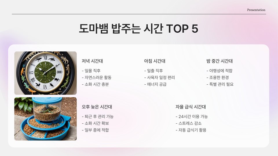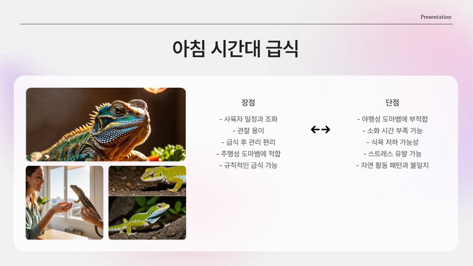 도마뱀에게 적절한 밥주는 시간은 그들의 건강과 체형 발달에 직접적인 영향을 미칩니다. 이를 위해서는 도마뱀의 종류와 환경, 나이와 크기를 고려하여 알맞은 방식으로 음식을 제공해야 합니다. 각 도마뱀의 특성을 잘 이해하고 적절한 식사 주기를 설정하는 것이 매우 중요합니다.