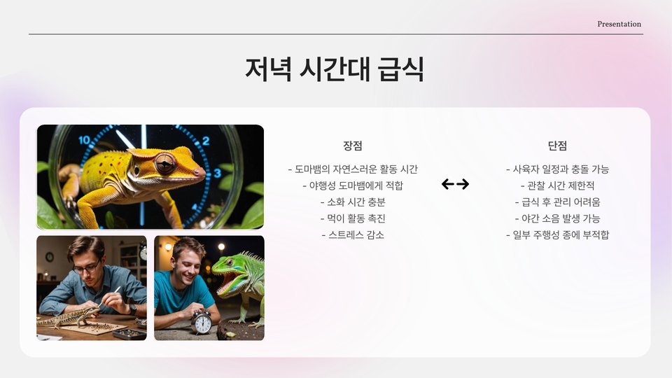 도마뱀은 다양한 종류가 있으며, 각 종류의 성장 속도와 먹는 패턴이 서로 다릅니다. 예를 들어, 일부 도마뱀은 저녁에 활발해지므로 밤에 밥을 주는 것이 좋습니다. 이에 따라, 도마뱀의 일주기 리듬과 생활 습관을 반영하여 밥주는 시간을 조정해주는 것이 중요합니다.