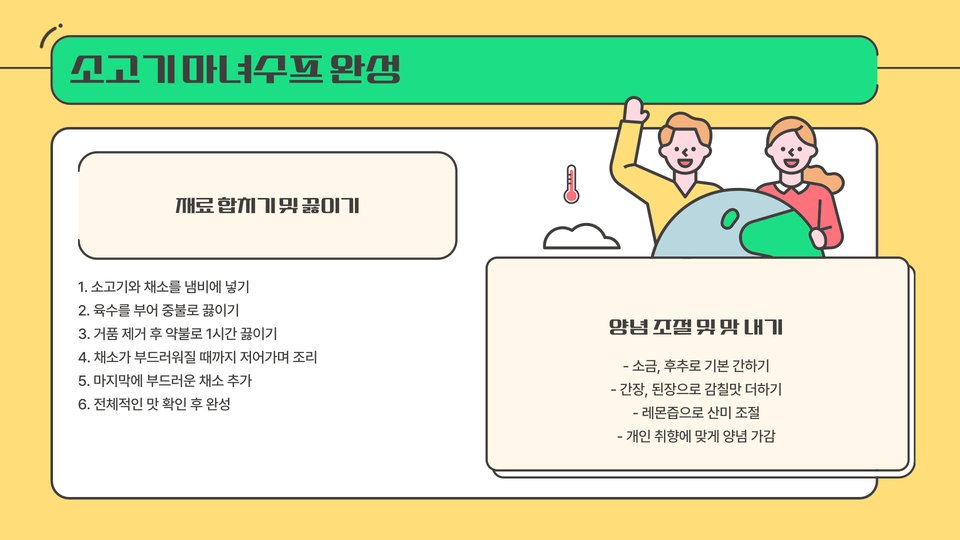 마녀수프를 더욱 맛있게 만드는 몇 가지 팁이 있습니다. 첫째, 소고기를 미리 재워두면 국물의 맛이 더욱 깊어질 수 있습니다. 간장,와인, 마늘 등을 활용하여 재워보세요. 둘째, 서빙할 때는 크림이나 파슬리를 토핑으로 추가하면 더욱 고급스러운 맛이 납니다.