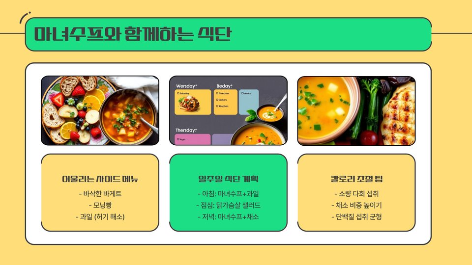 마녀수프는 그 자체로도 훌륭하지만, 다양한 곁들임과 함께하면 더욱 특별한 한 끼가 됩니다. 바삭한 빵이나 신선한 샐러드와 함께 서빙하세요. 이렇게 하면 수프의 풍미가 더욱 살아납니다. 또한, 남은 수프는 냉장 보관 후 재가열하여도 맛이 좋습니다. 수프의 깊은 맛은 시간이 지날수록 더욱 진해지기 때문입니다.