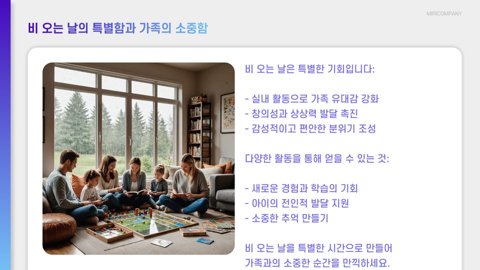 비 오는 날은 부산에서 새로운 경험을 할 수 있는 특별한 날입니다. 아이와 함께하는 시간은 더욱 소중하고 특별합니다. 오늘 소개한 여러 가지 활동을 통해 비 오는 날을 더욱 의미 있게 만들어 보세요. 즐거운 기억은 아이에게 소중한 추억으로 남게 될 것입니다. 무엇보다도, 아이와의 소중한 시간을 잊지 말고, 행복한 시간을 보내세요!