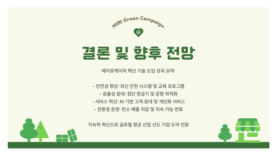 마지막으로, 에어로케이의 친환경 기술 개발은 현대 사회에서 기업의 사회적 책임을 다하는 방법의 한 예라고 할 수 있습니다. 지속 가능한 발전을 추구하는 접근 방식은 점점 더 많은 소비자들이 요구하는 바이며, 이것이 기업의 브랜드 가치와 신뢰성에 긍정적인 영향을 미치는 요소가 됩니다.