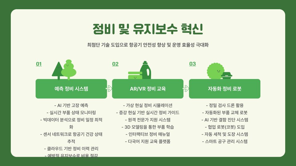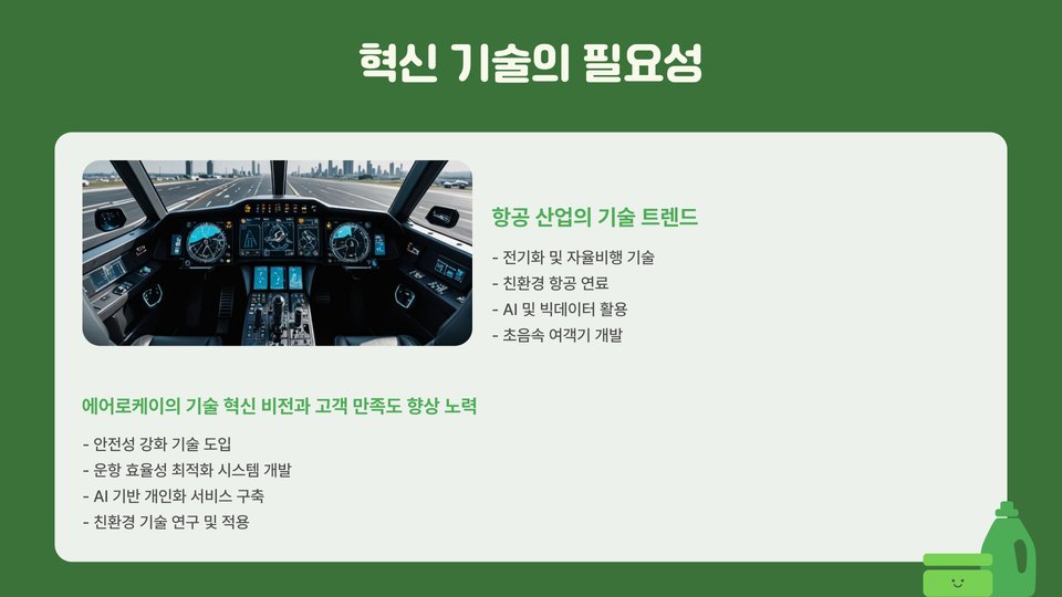 또한, 에어로케이의 혁신 기술은 자동화 시스템을 통해 항공기 점검 및 유지보수의 효율성을 높이고 있습니다. 이는 항공 안전을 더욱 강화하고, 비용 절감에도 기여하고 있어 항공사 운영에 있어 큰 장점이 됩니다.