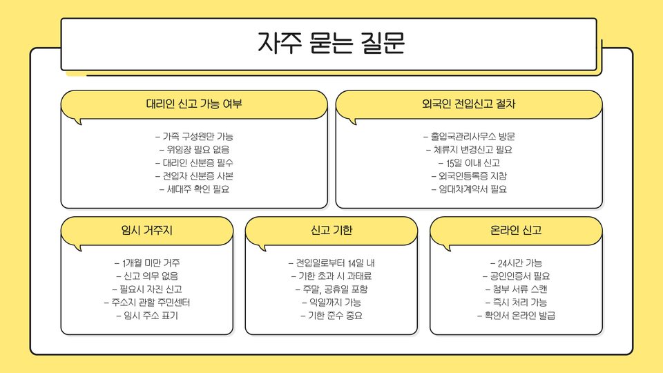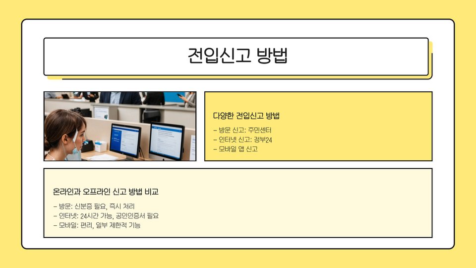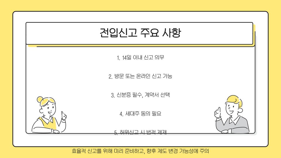 마지막으로, 전입신고와 관련된 각종 서비스나 혜택이 변경될 수 있으므로, 신고 후에는 관련 정보를 업데이트하는 것이 필요합니다.