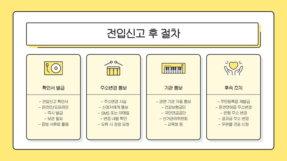전입신고를 완료한 후 몇 가지 유의해야 할 점이 있습니다. 가장 먼저, 새로운 주소지를 기반으로 각종 공공 서비스를 변경해야 합니다. 예를 들어, 의료 서비스, 주택 청약, 그리고 교육 관련 정보 등이 이에 해당됩니다. 따라서, 필요한 기관에 주소 변경 통보를 잊지 않도록 해야 합니다.