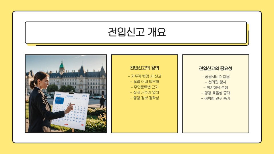 전입신고는 대한민국에 거주하는 모든 국민이 자신의 거주지를 변경할 때 반드시 진행해야 하는 절차로, 여러 가지 법적 요건을 충족해야 합니다. 이는 주민등록법에 따라 주민등록지를 신고하는 과정입니다. 복잡하게 느껴질 수 있지만, 필요한 서류와 절차를 잘 이해하면 쉽게 대응할 수 있습니다. 이번 포스트에서는 전입신고에 필요한 서류와 최신 정보에 대해 자세히 안내하겠습니다.