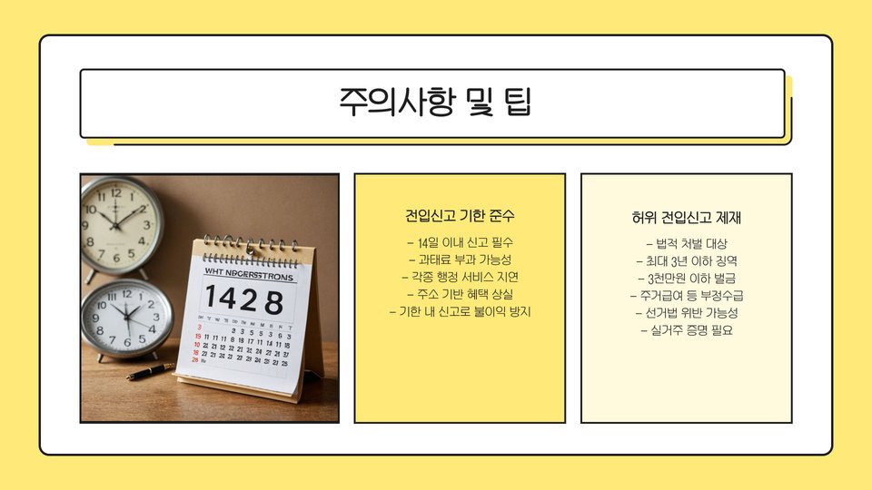 중요 팁: 전입신고를 지연할 경우, 최대 20일 이상의 과태료가 부과될 수 있으니, 이사 후 즉시 신고하는 것이 불이익을 피하는 최선의 방법입니다.