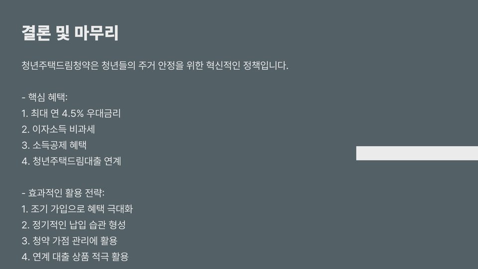 청년주택드림청약은 청년층에게 안정적인 주거지를 제공하기 위한 유용한 정책입니다. 청년들이 이 제도를 잘 이해하고 활용한다면, 보다 나은 주거 환경을 마련할 수 있을 것입니다. 본 가이드를 통해 청년주택드림청약의 모든 것을 알아보셨다면, 이제 직접 신청해보시기 바랍니다!