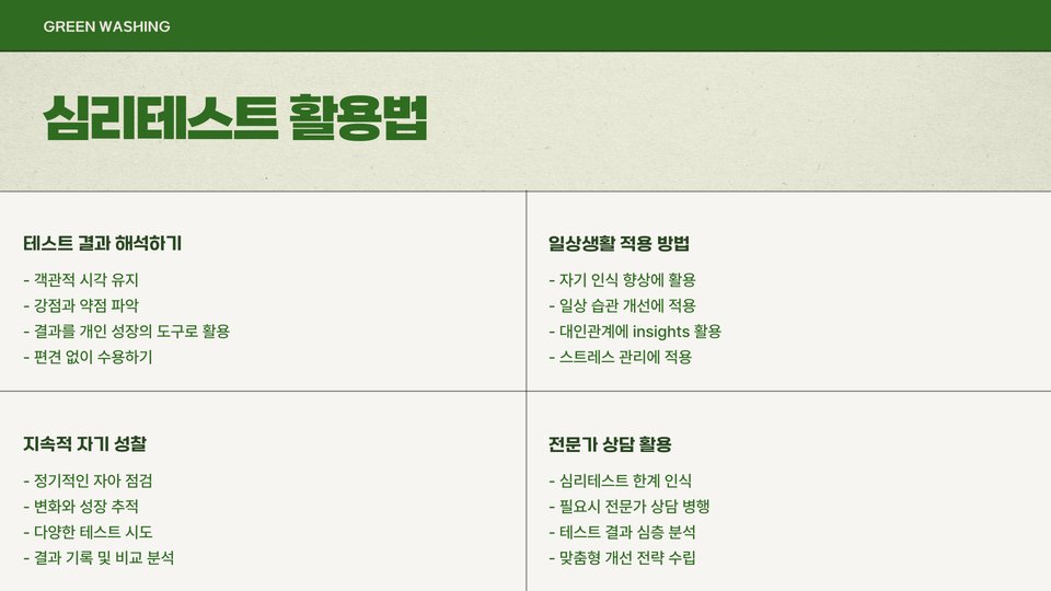- 심리테스트는 자기 인식을 높이는 데 유용하다.