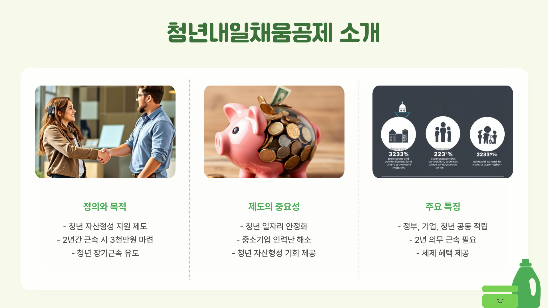 청년내일체움공제는 정부가 지원하는 제도로, 고용보험에 가입된 만 29세 이하의 청년이 일정 기간 동안 자산을 형성할 수 있도록 도와주는 프로그램입니다. 이 제도의 목표는 청년들이 안정된 직장을 갖고 자산을 축적할 수 있는 기회를 제공하여, 젊은 세대의 경제적 자립을 도모하는 것입니다. 예를 들어, 청년이 기본적으로 매달 일정 금액을 적립하는 동시에 정부로부터 추가 지원금을 받을 수 있는 구조로 되어 있습니다.